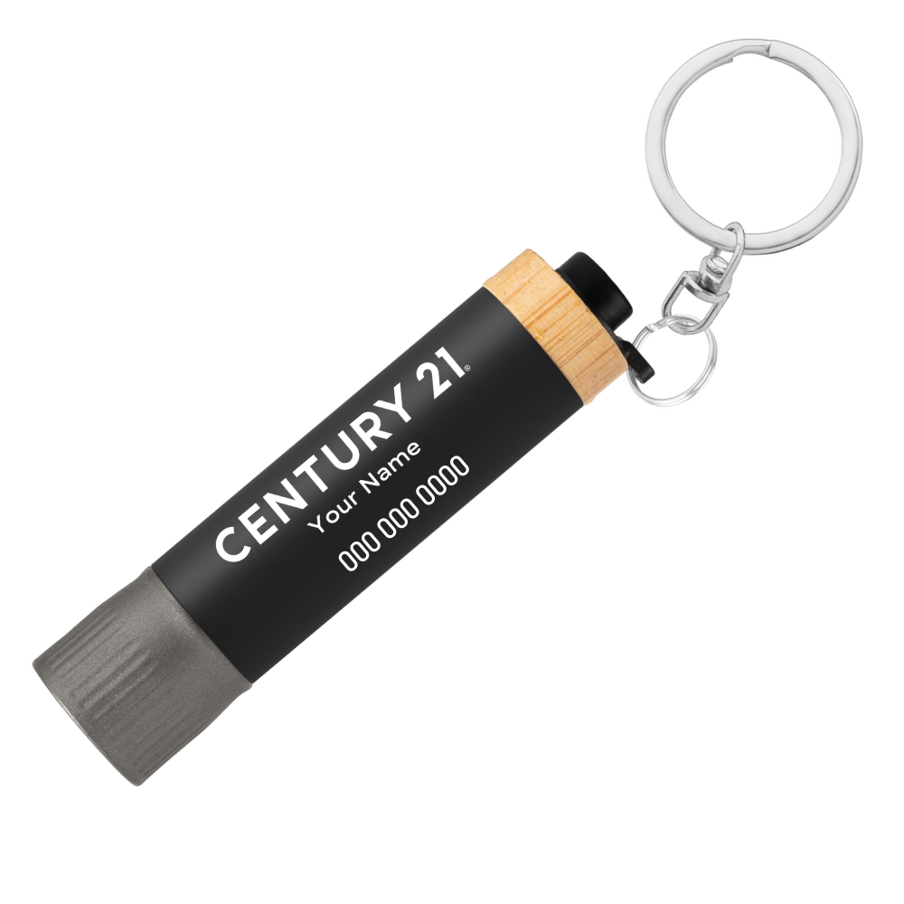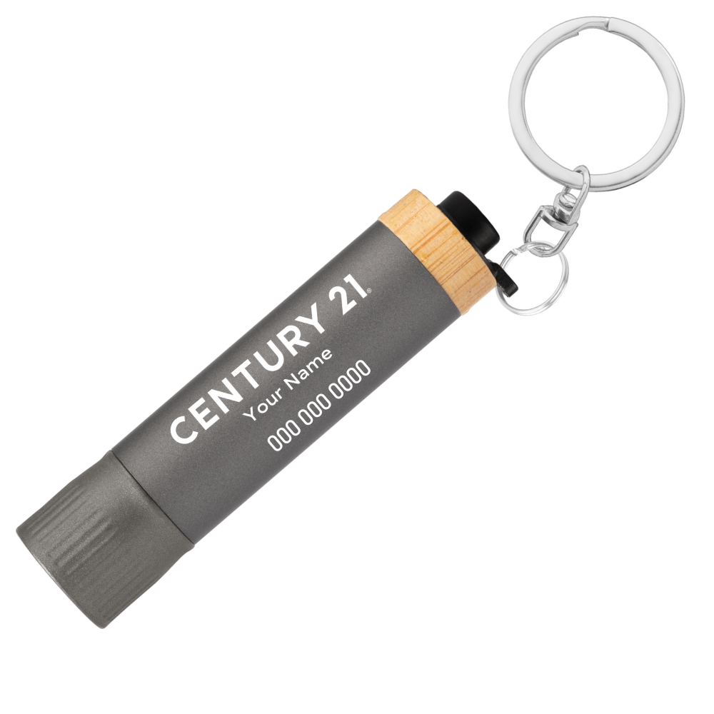Crafted from recycled aluminum and finished with a responsibly sourced bamboo end, this sleek keychain flashlight blends modern design with eco-conscious materials. The matte-painted recycled aluminum barrel offers a refined look, while the gunmetal-painted RABS end creates a stylish contrast. A rubber push-button sits neatly in the bamboo end for smooth on/off control.