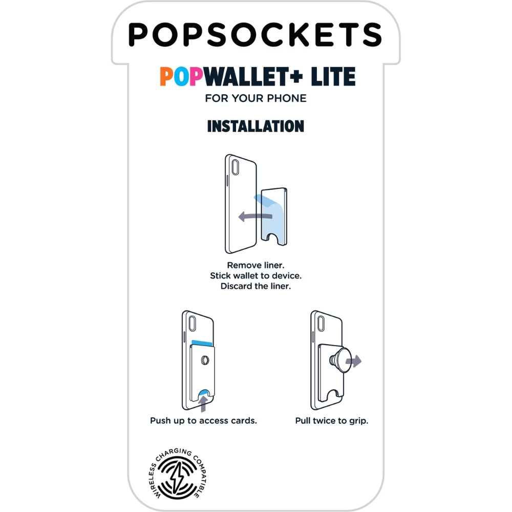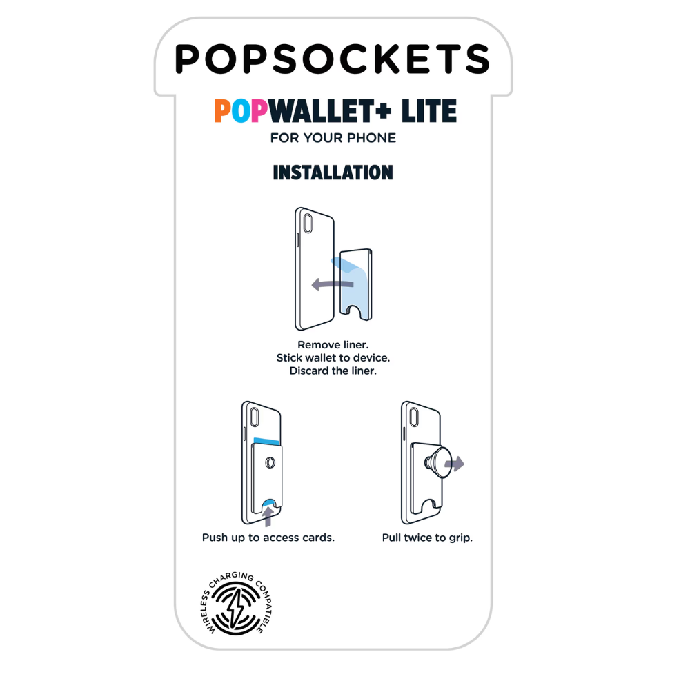 The Pop Wallet Plus Lite offers a secure way to carry important cards on your phone. The silicone wallet includes a built-in PopGrip. Once extended, it becomes a media stand and cell phone grip. Fold it flat to fit in a pocket.