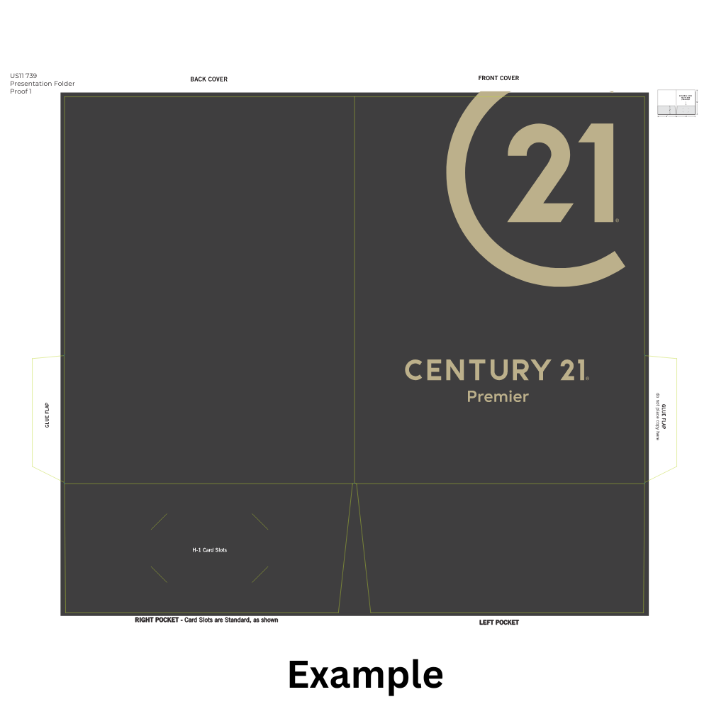 Please let us know what you would like printed on your Folder in 'Additional Details' or email debra@century21promoshopusa.com.