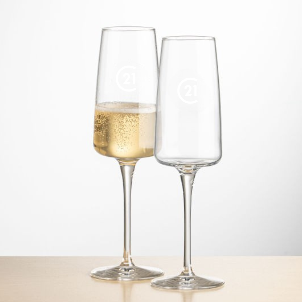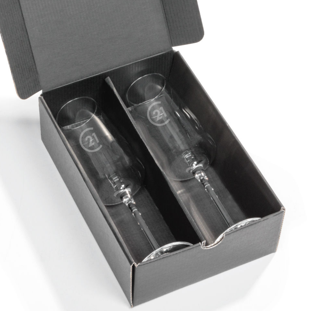 Celebrate in style with this elegant 2-glass gift set. Each Dunhill lead-free crystal flute is deep etched with the C21 logo, and the gift box is custom printed with your logo or message.