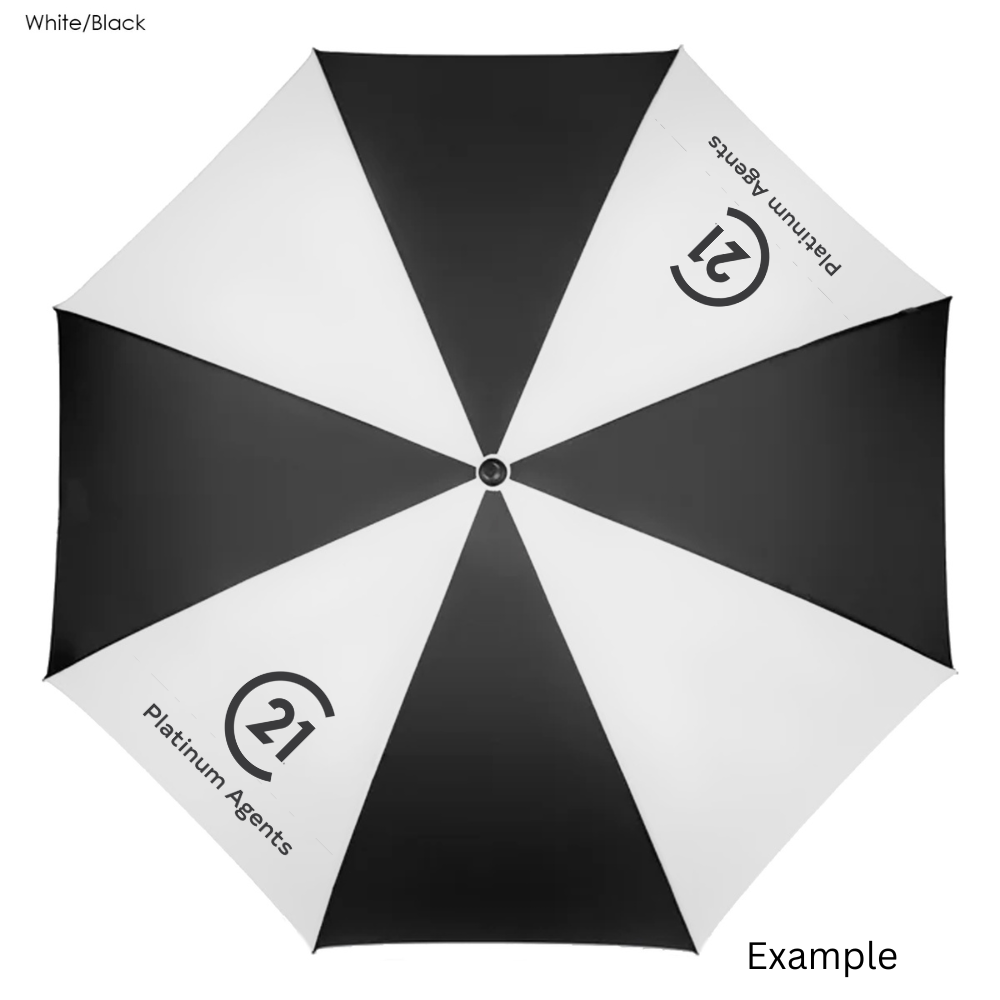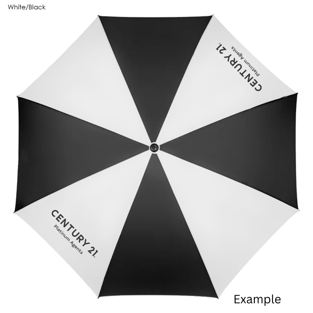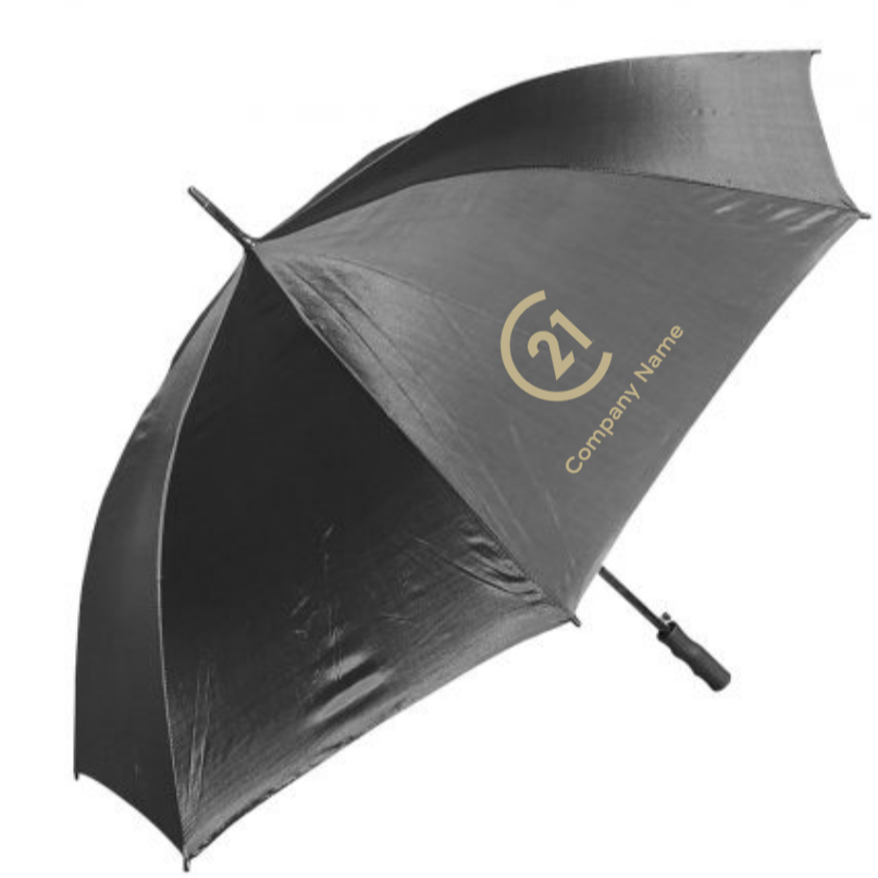 High quality automatic opening wind proof and showerproof golf umbrella, eight-panel 190T polyester canopy with a velcro tie, strong fiber glass shaft with a metal tip, black molded soft-touch rubber handle and 75cm ribs.