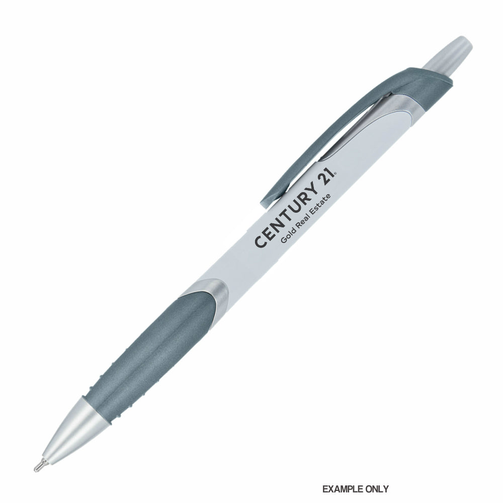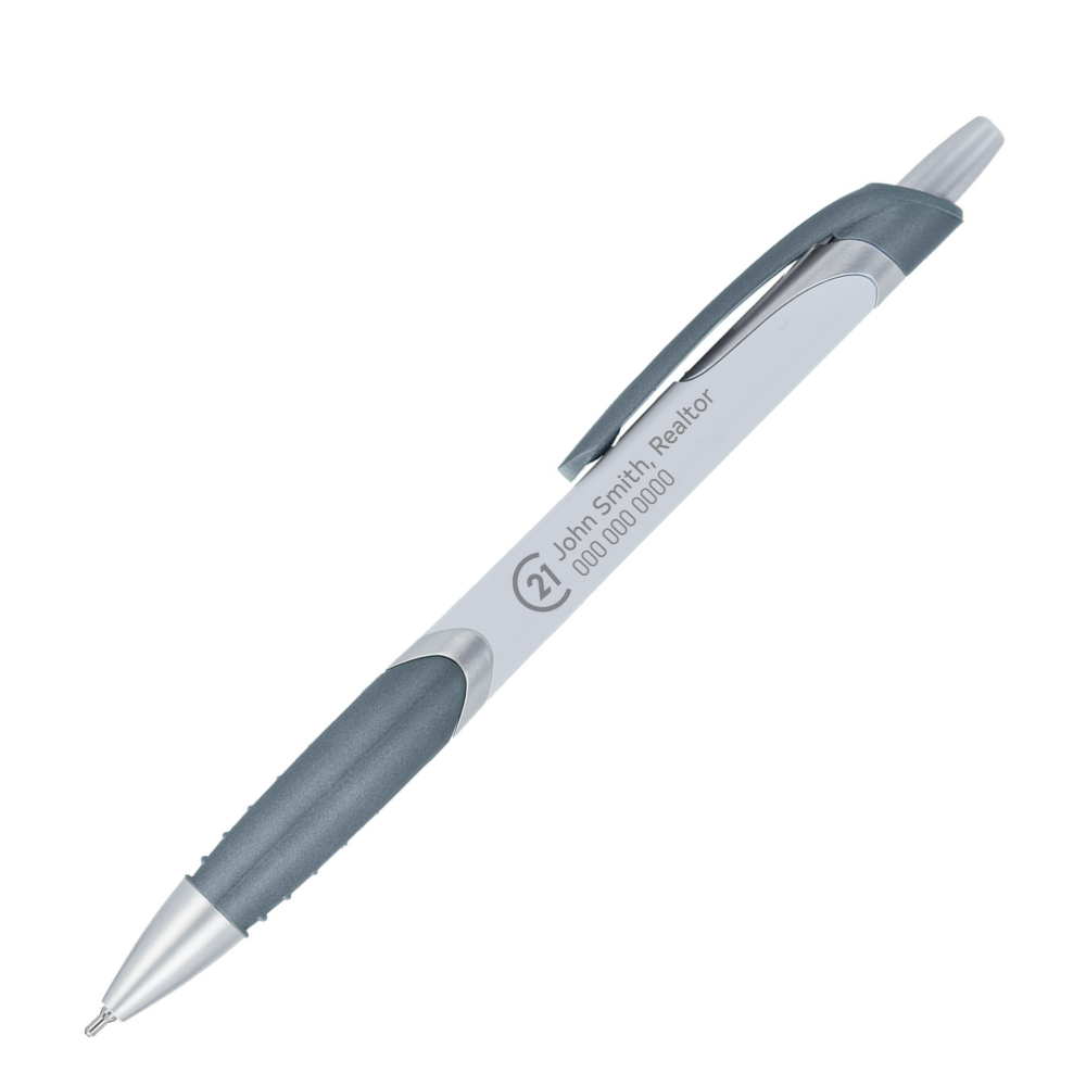 The Solana Grip pen features a black rubber grip and a quick-click plunger, for a smooth and comfortable writing experience. An affordable plastic pen with metallic curb appeal, the silver accents and imprints make this pen stand out from the rest. Great for clipping to brochures and collateral at tradeshows and events.