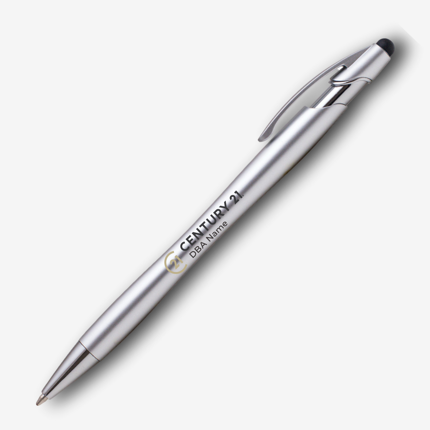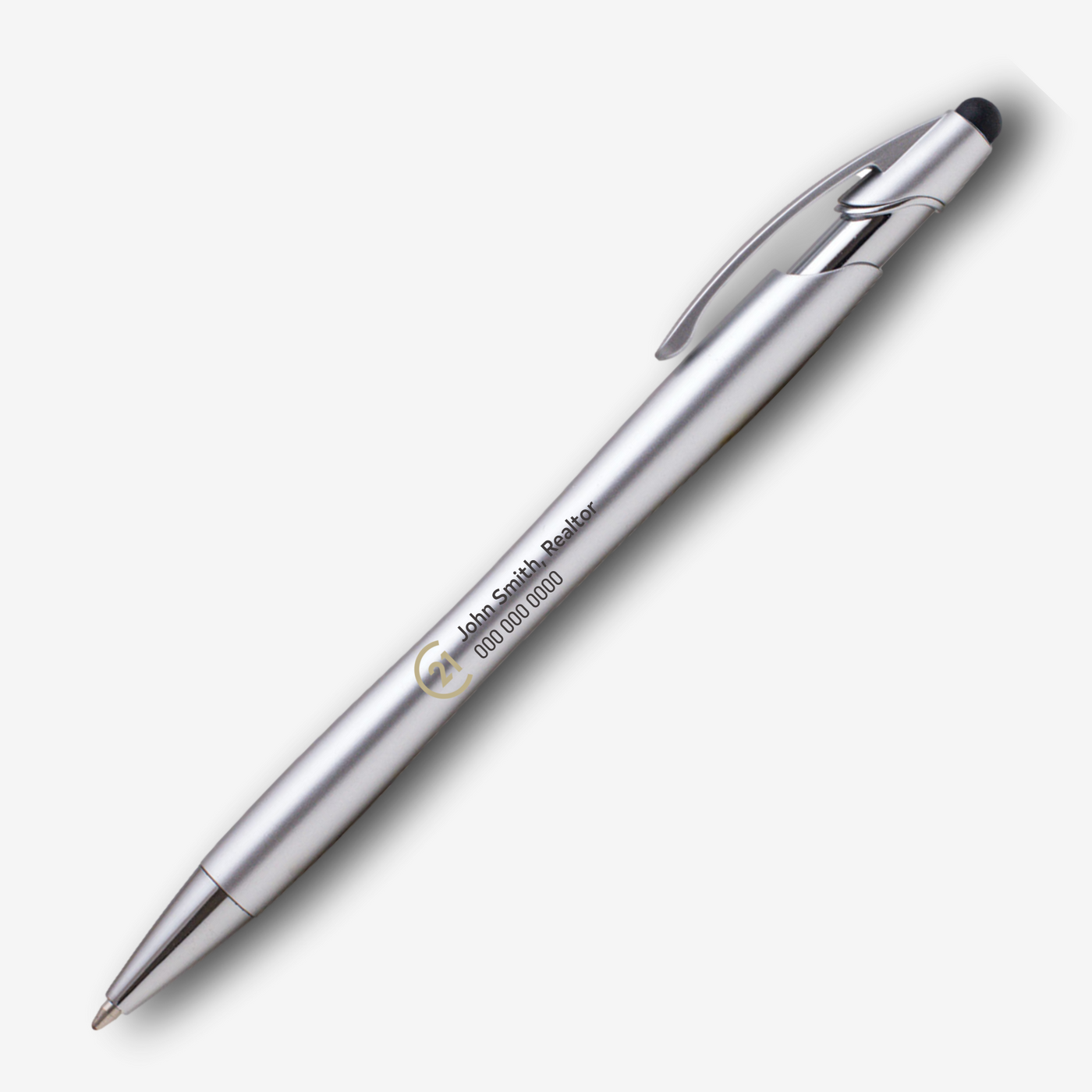 This metallic pen with a stylus at the top is the perfect 2-in-1 advertising gift. It features a sleek metallic barrel, matching clip, polished chrome accents and a professional stylus.