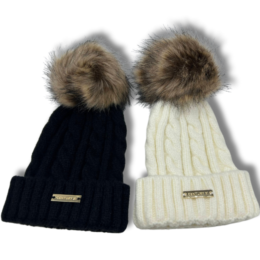 Crafted from a chunky wool-mix knit, it features a classic cable pattern that adds both texture and timeless appeal. The generously sized luxury faux-fur pom creates a soft, full, and glamorous finish.