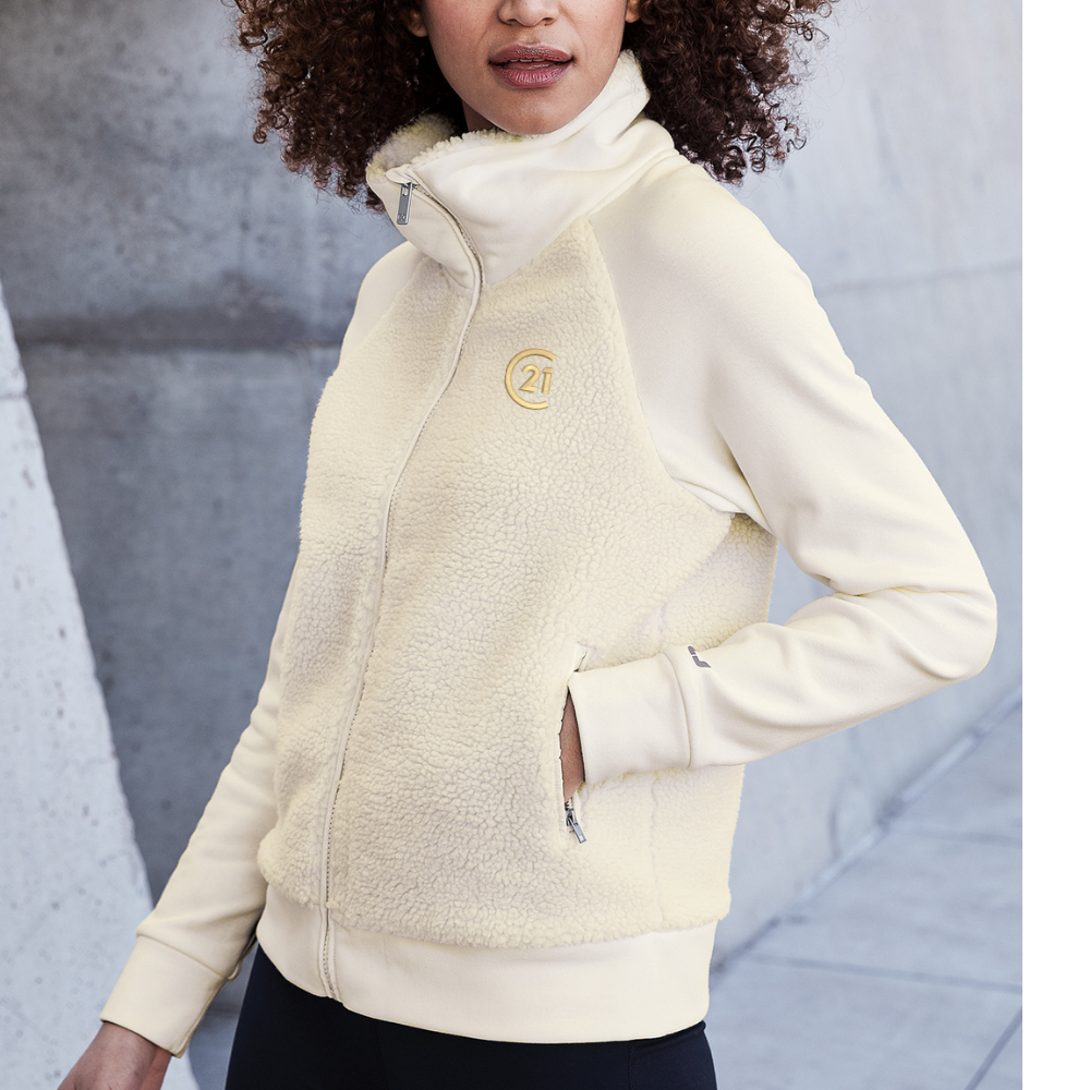 A sherpa fleece body joins performance poly for the ultimate in coziness and mobility in beautiful Ivory Snow colour.