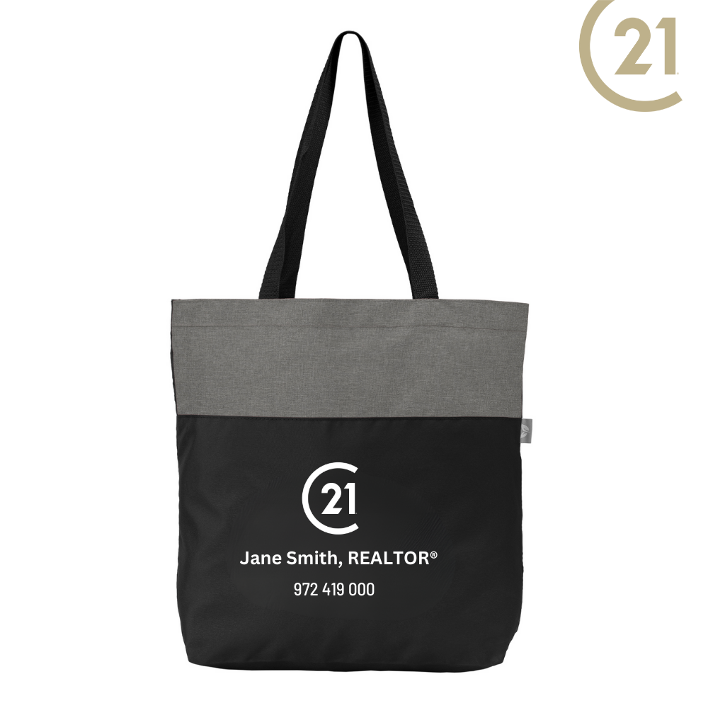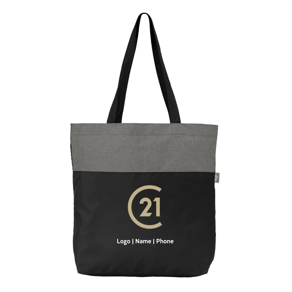 RPET 300D Tote Bag, A stylish accessory for your everyday needs. The heathered color block design is complemented by the material, crafted from 100% 300D RPET polyester. The tote features long handles with a comfortable size of 25.98" ensuring easy carrying. Measuring 13.78" x 16.93" x 4.72" , it offers a spacious 10 L capacity, supporting a maximum weight of 11 lbs. An eco tag, made of Jacquard material, is sewn on the outside of the bag. The tag features a leaf design on one side and "recycled RPET" on the other, making this tote a mindful and chic choice. Your logo will be imprinted in Silkscreen in White.