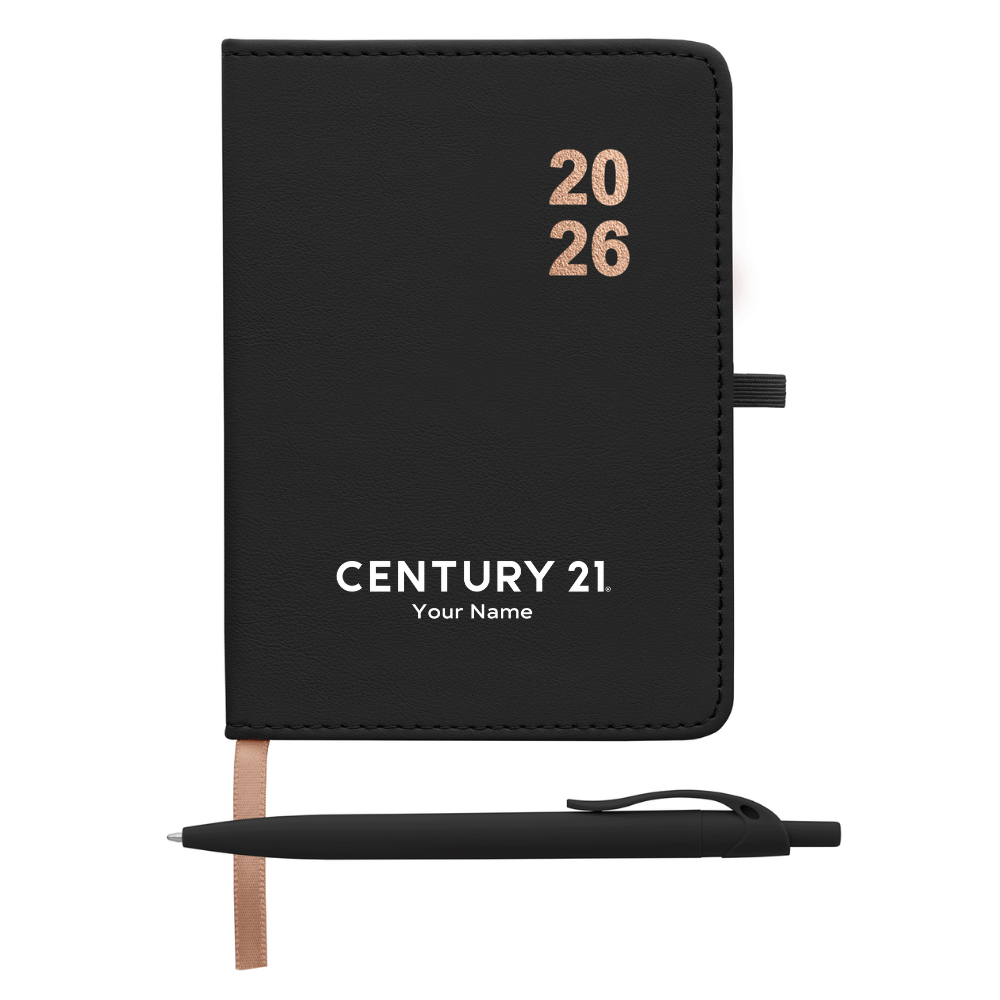 Rose Gold accents include the year 2026 on the cover and a Rose Gold ribbon bookmark. Your logo will stand out, silkscreened in white on the cover.