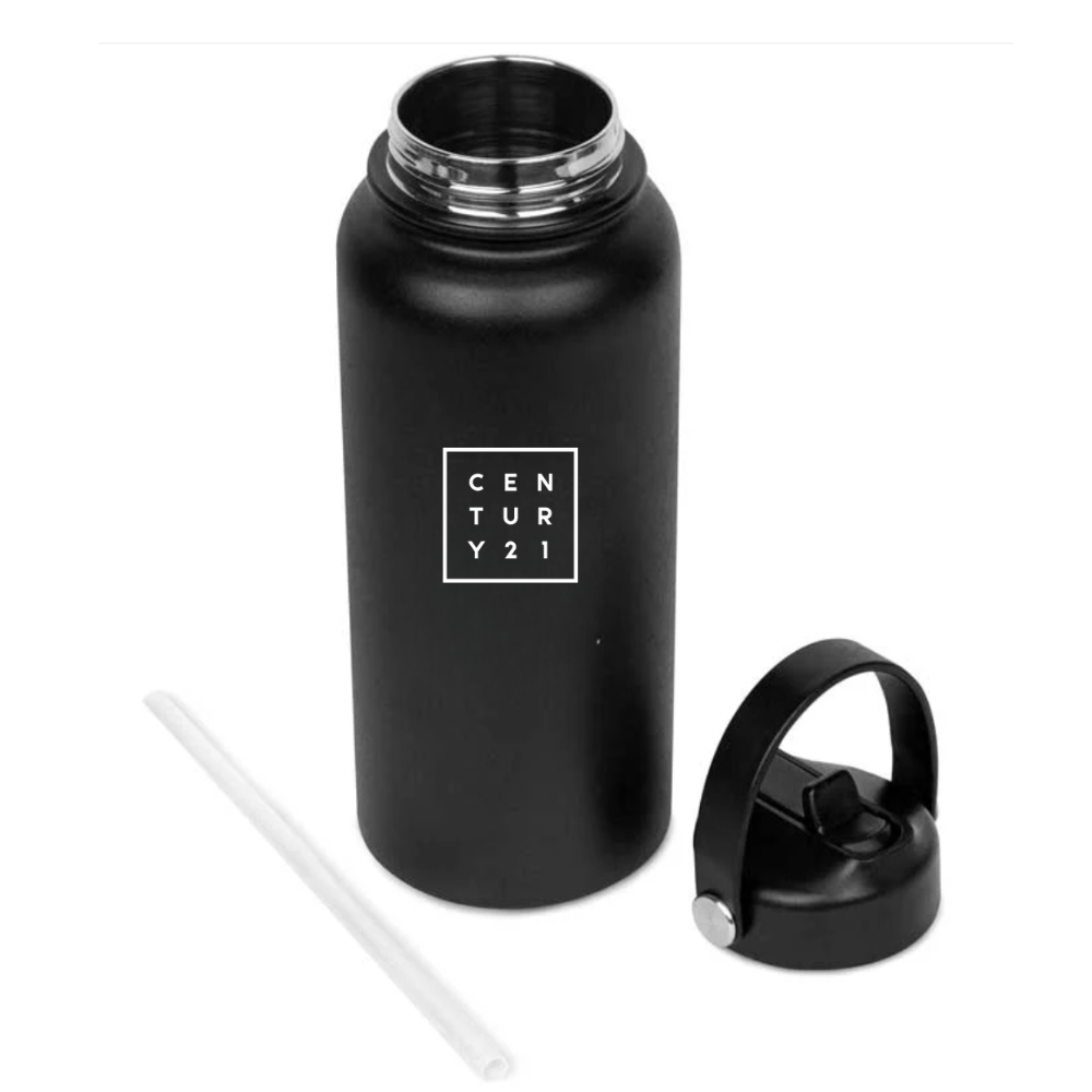 Stay hydrated in style with the Holly 32 oz. Water Bottle. Featuring a sleek matte black powder-coated finish, flexible silicone carry handle, and CENTURY 21 square logo printed in white, it’s built for both performance and presence.
