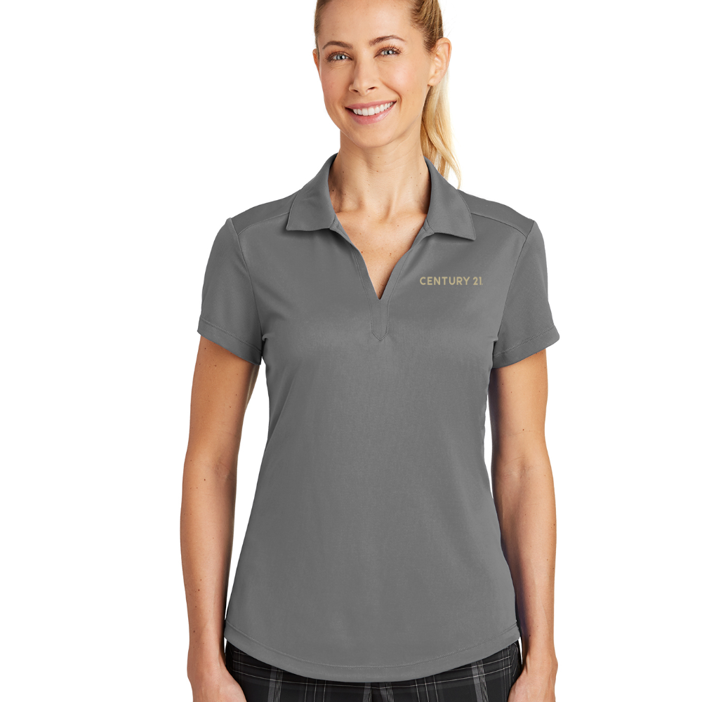 Tailored for a feminine fit. Design details include a self-fabric collar with an open Y-neck placket and open hem sleeves. The contrast heat transfer Swoosh design trademark is on the left sleeve. Made of 4.2-ounce, 100% polyester Dri-FIT fabric.