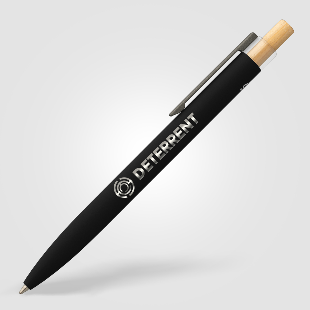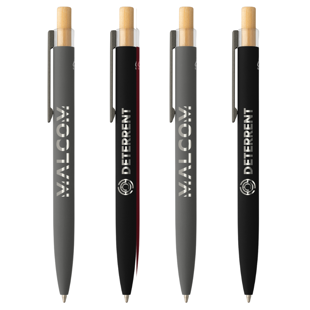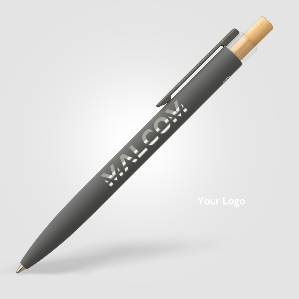A perfect blend of style and performance, the Reborn Recycled Aluminum Deluxe Pen features a sleek recycled aluminum barrel with a rubber-painted finish. The clear RPET plastic top and bamboo plunger add distinct, quality touches. Featuring a Parker-style refill, it ensures a smooth writing experience for up to 2000 meters. A standout feature of this pen is its laser engraving with a mirror finish, providing a sophisticated touch. Opposite the gunmetal-painted steel clip, a subtle engraved recycled symbol highlights the pen’s sustainable origin.